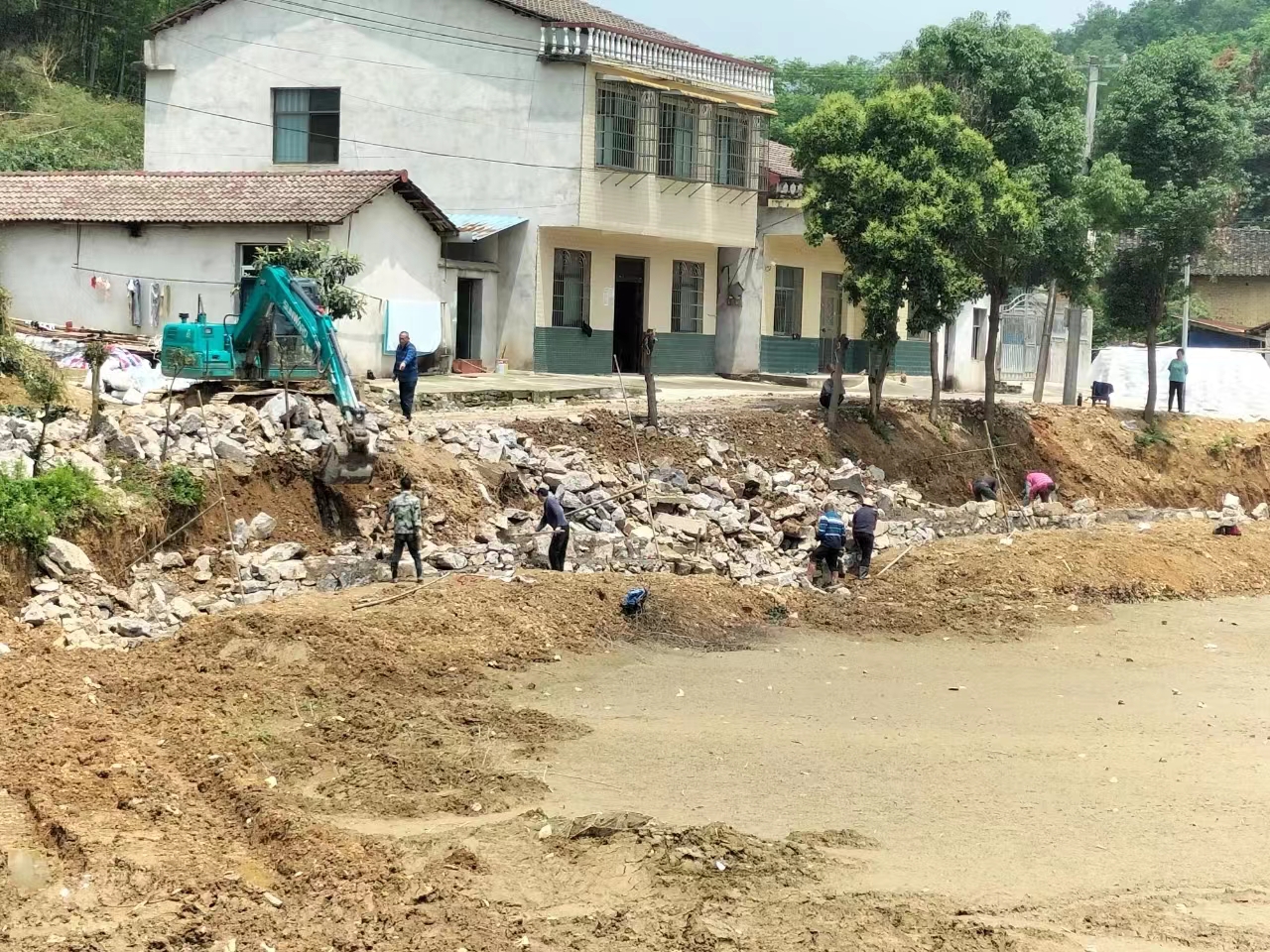 5月24日,赤壁市新店鎮(zhèn)蒲首山村陳家莊,赤壁水建集團(tuán)施工隊(duì)正在挖機(jī)的幫助下,打石塊,鋪砂漿,抓緊對(duì)村莊前的池塘進(jìn)行塘堰坡岸護(hù)砌。