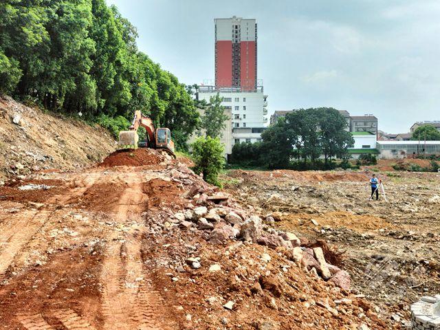 8月15日,在赤壁二橋北岸,陸水二橋低碳運動公園項目工地上,赤壁水建集團工作人員正在測量數(shù)據(jù),組織挖掘機清理場地。